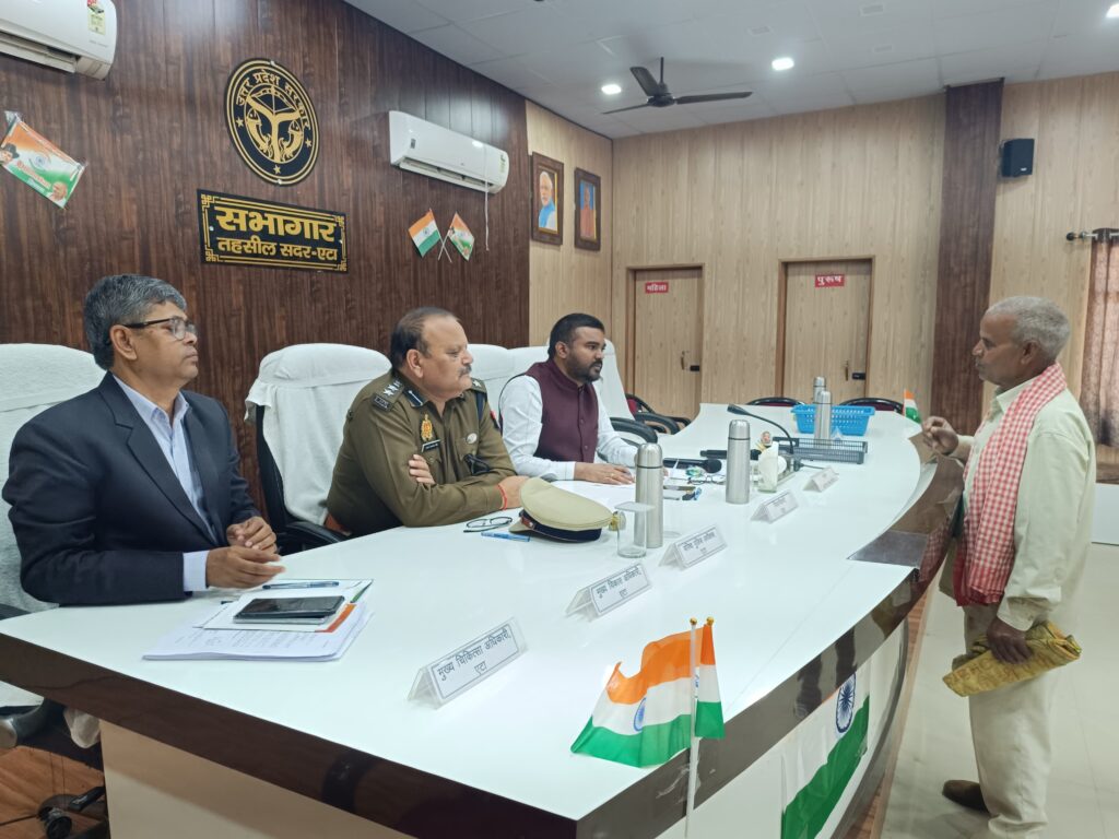 एटा:- जिलाधिकारी प्रेम रंजन सिंह की अध्यक्षता में शनिवार को तहसील सदर एटा में सम्पूर्ण समाधान दिवस का आयोजन किया गया। जिलाधिकारी ने जनसामान्य से प्राप्त शिकायतों को गंभीरता से सुनते हुए संबंधित विभागीय अधिकारियों को निर्देशित किया कि सभी प्रकरणों का निर्धारित समय सीमा में गुणवत्तापूर्ण एवं संतोषजनक निस्तारण सुनिश्चित किया जाए।